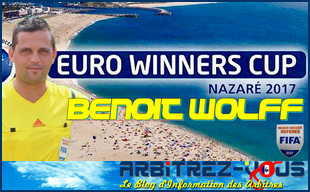 Publié le 31/03/2017 - Puisqu'une bonne nouvelle n'arrive jamais seule... Après la nomination de Sofien BENCHABANE pour la COUPE DU MONDE de BEACHSOCCER au Bahamas, c'est au tour de Benoît WOLFF d'être désigné pour arbitrer l'EURO WINNERS CUP qui se déroula du 25 mai au 5 juin 2017 à Nazaré au Portugal.